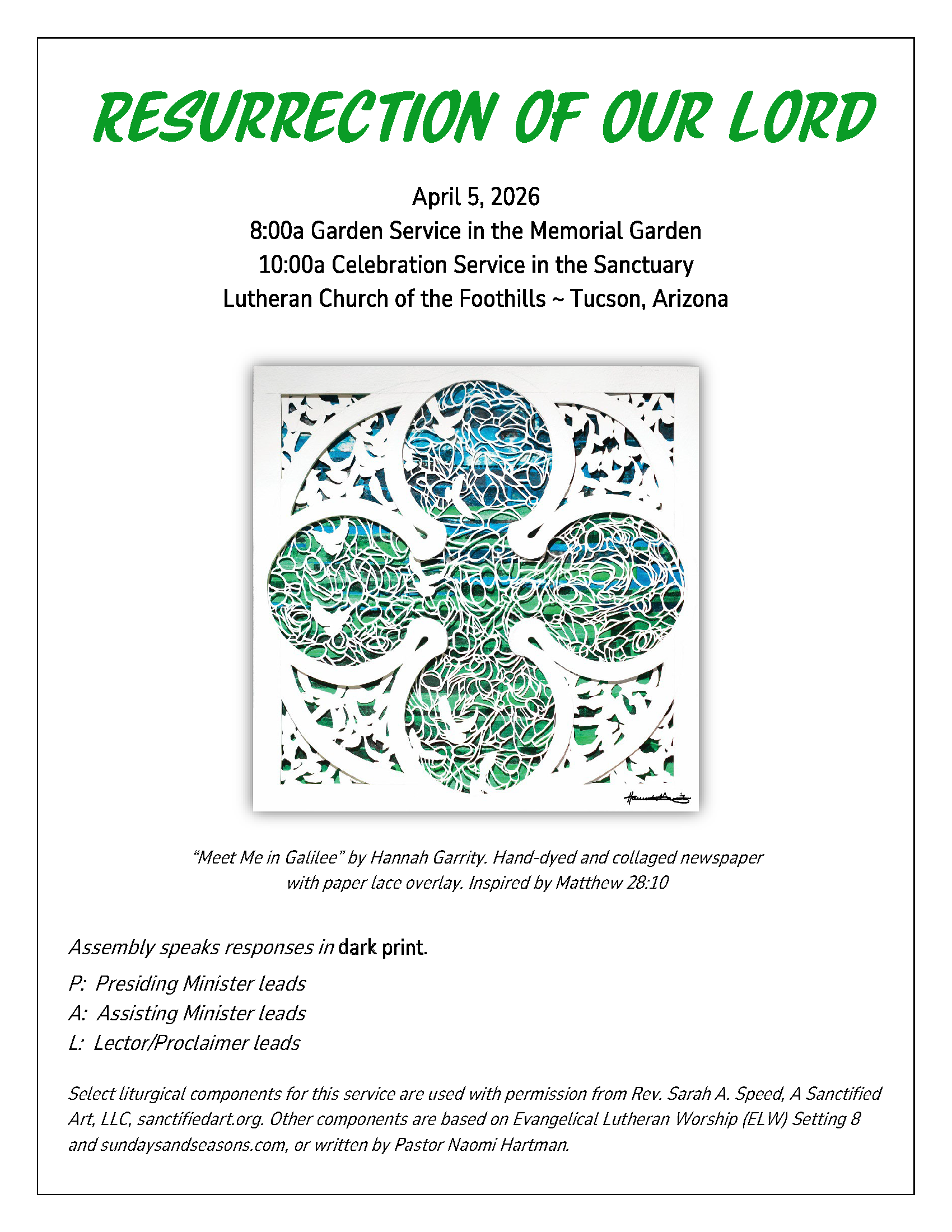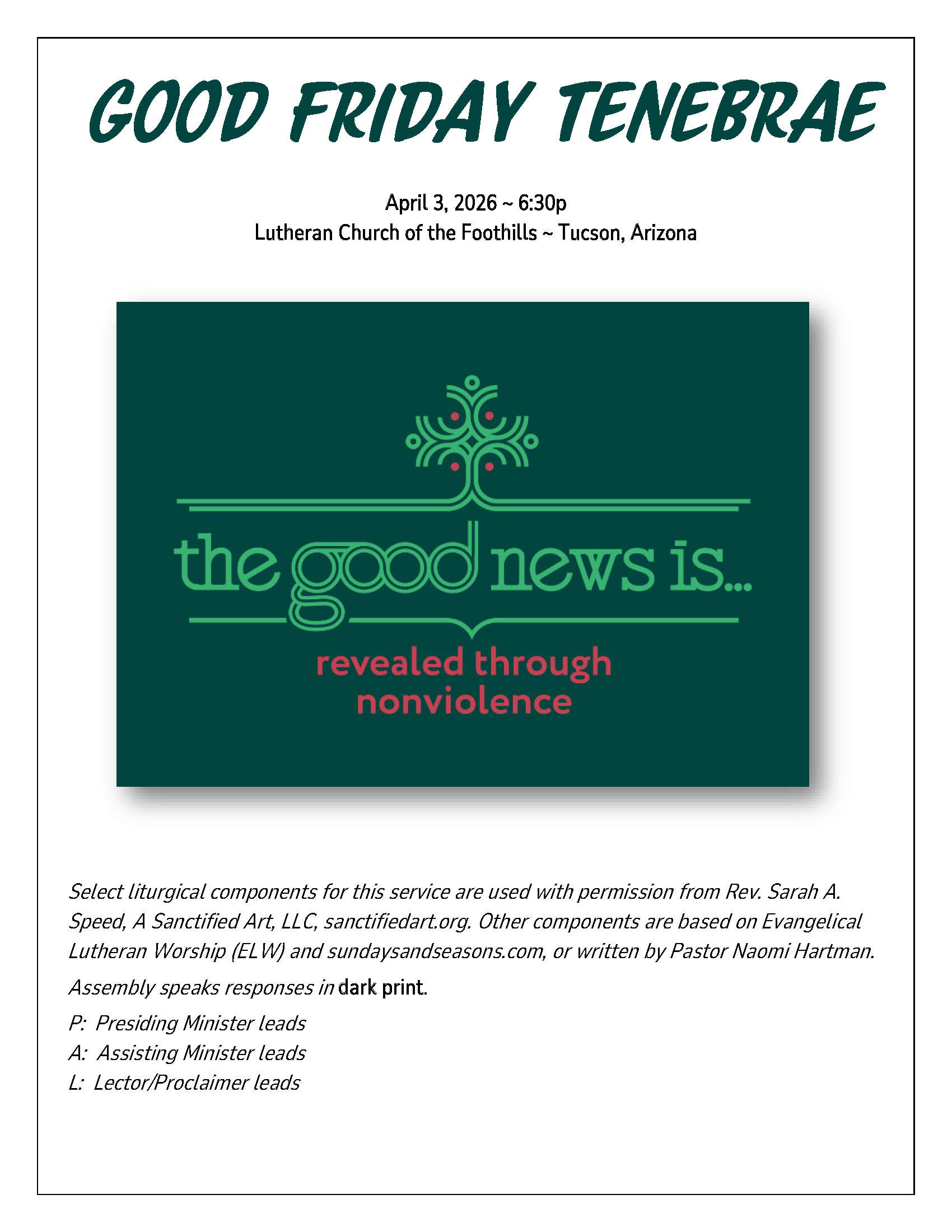 Lutheran Church of the Foothills is located on the original and ancestral homelands of the Tohono O’odham and Pascua Yaqui nations, and we give thanks for their presence here since time immemorial. We also wish to recognize and honor all our Indigenous siblings who have and continue to call this land their home. We acknowledge the historical injustices and colonialism perpetrated on these Indigenous Peoples, past and present, and we strive to be mindful of our complicity and work toward building right relationships with all Native nations and Native peoples.