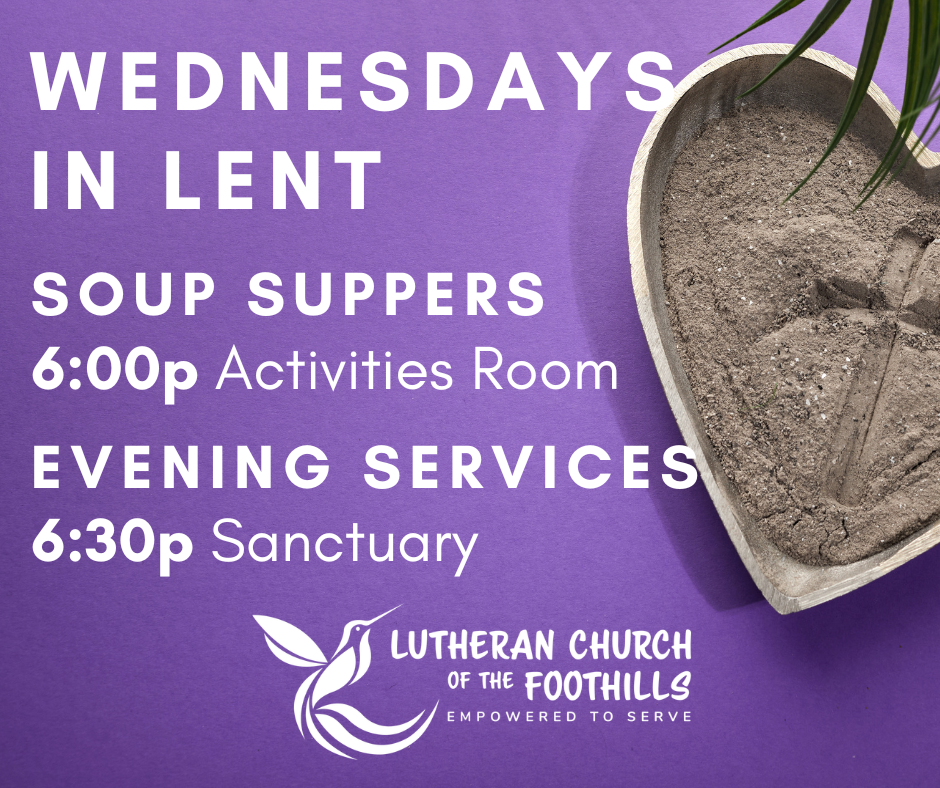 Beginning February 25 and ending March 25. Every Wednesday in Lent at 6:00p in the Activities Room join us for a simple soup and bread supper. See the signup on the Activities Counter.