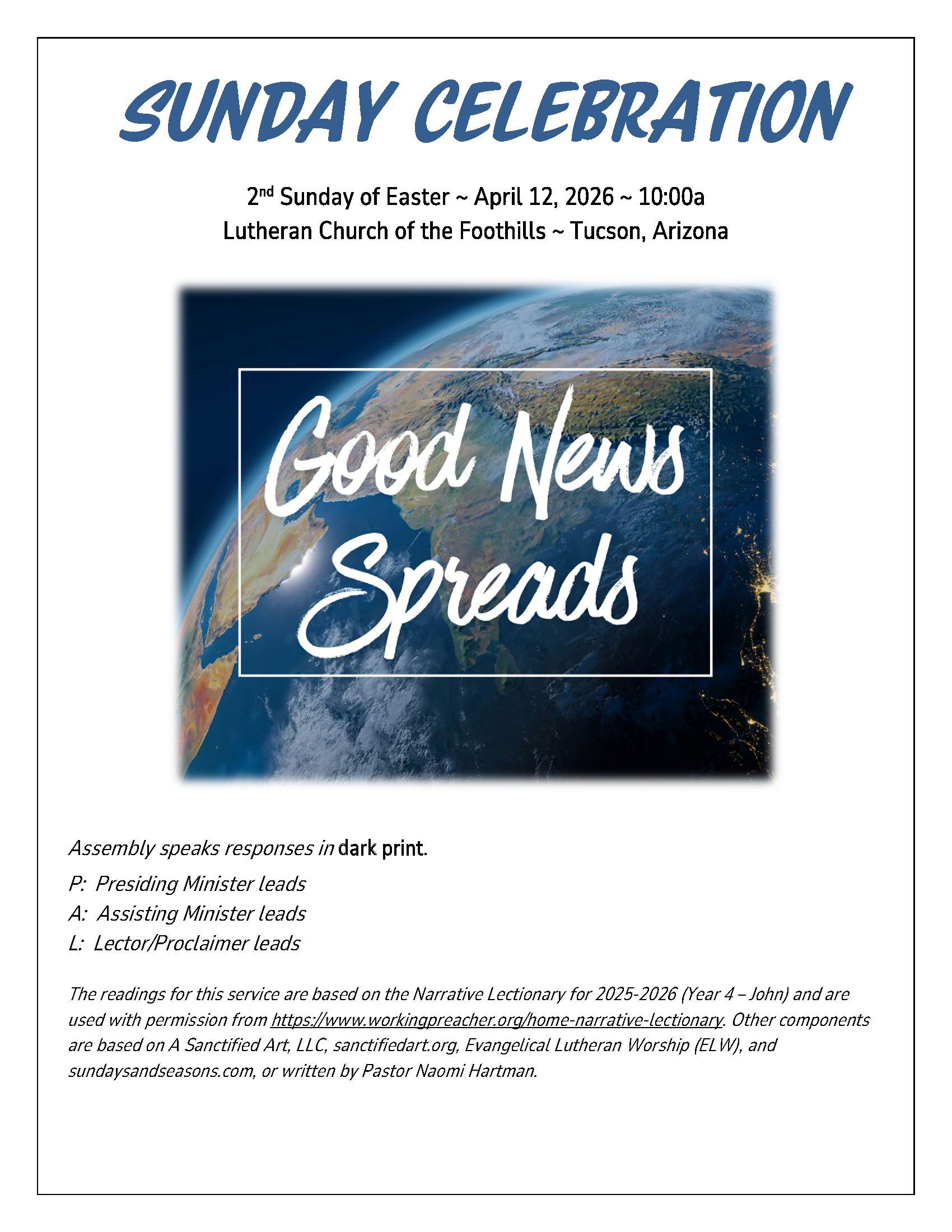 Sunday Bulletin, Worship Service, and Sharing God’s Story @home Devotional Links for April 12, 2026 Sunday Bulletin Apr 9 Written By Brian Flatgard April 12, 2026 bulletin Live-streaming of the 10:00 worship service Sharing God's Story @ Home Devotional Click the image or the button to access the current Sunday Celebration 10:00a service bulletin. Sunday Bulletin Brian Flatgard Brian Flatgard is a writer and web designer living in Phoenix, Arizona. http://www.brianflatgard.com